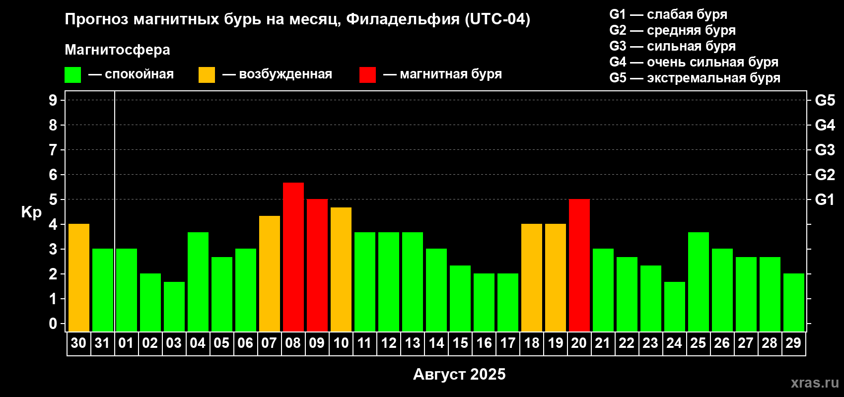 Прогноз магнитных бурь в Филадельфии — 30 июля 2025 года