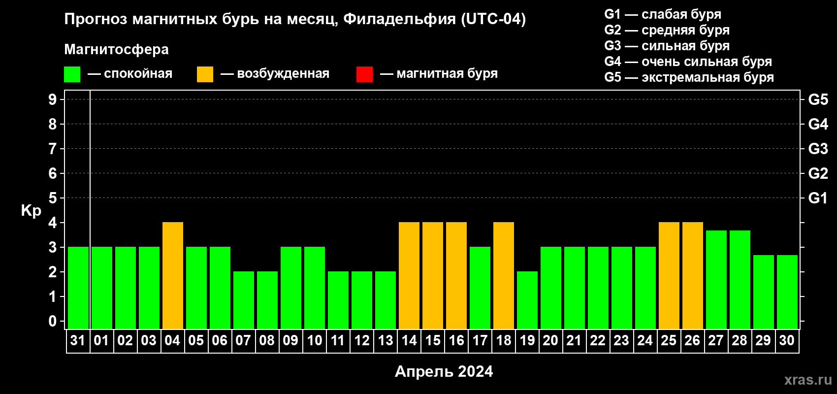 Прогноз магнитных бурь в Филадельфии — 31 марта 2024 года