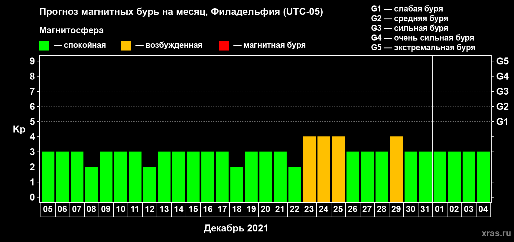 Прогноз магнитных бурь в Филадельфии на 5 декабря 2021 года