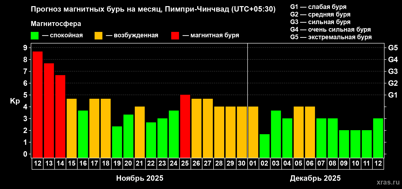 Прогноз магнитных бурь в Пимпри-Чинчваде — 12 ноября 2025 года