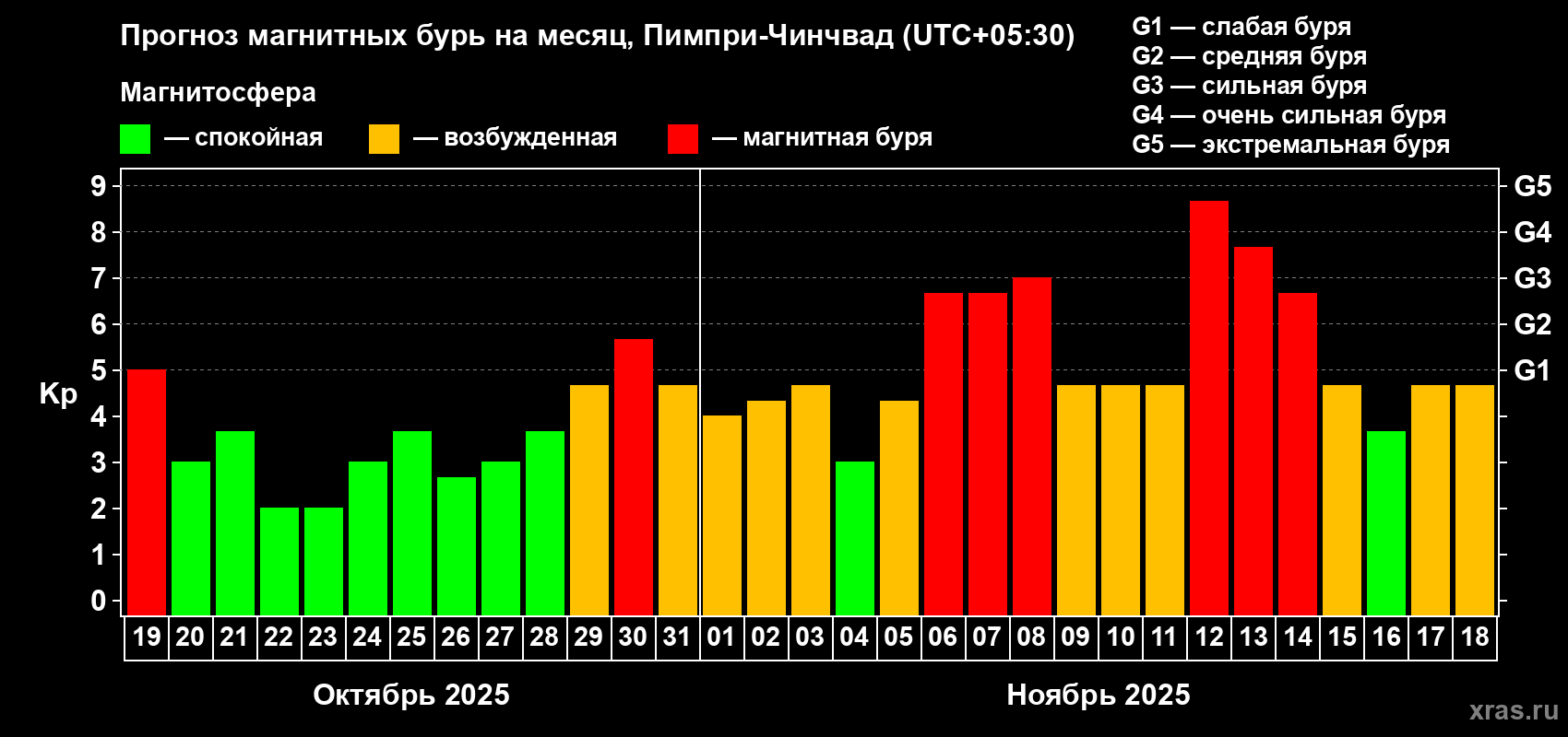 Прогноз магнитных бурь в Пимпри-Чинчваде — 19 октября 2025 года