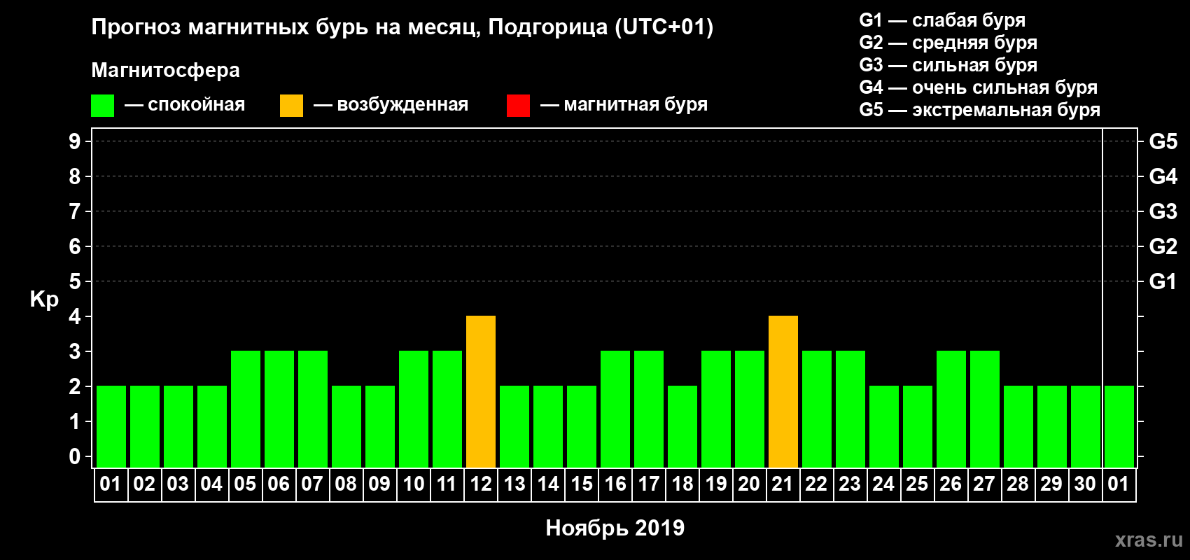 Прогноз магнитных бурь в Подгорице — 1 ноября 2019 года