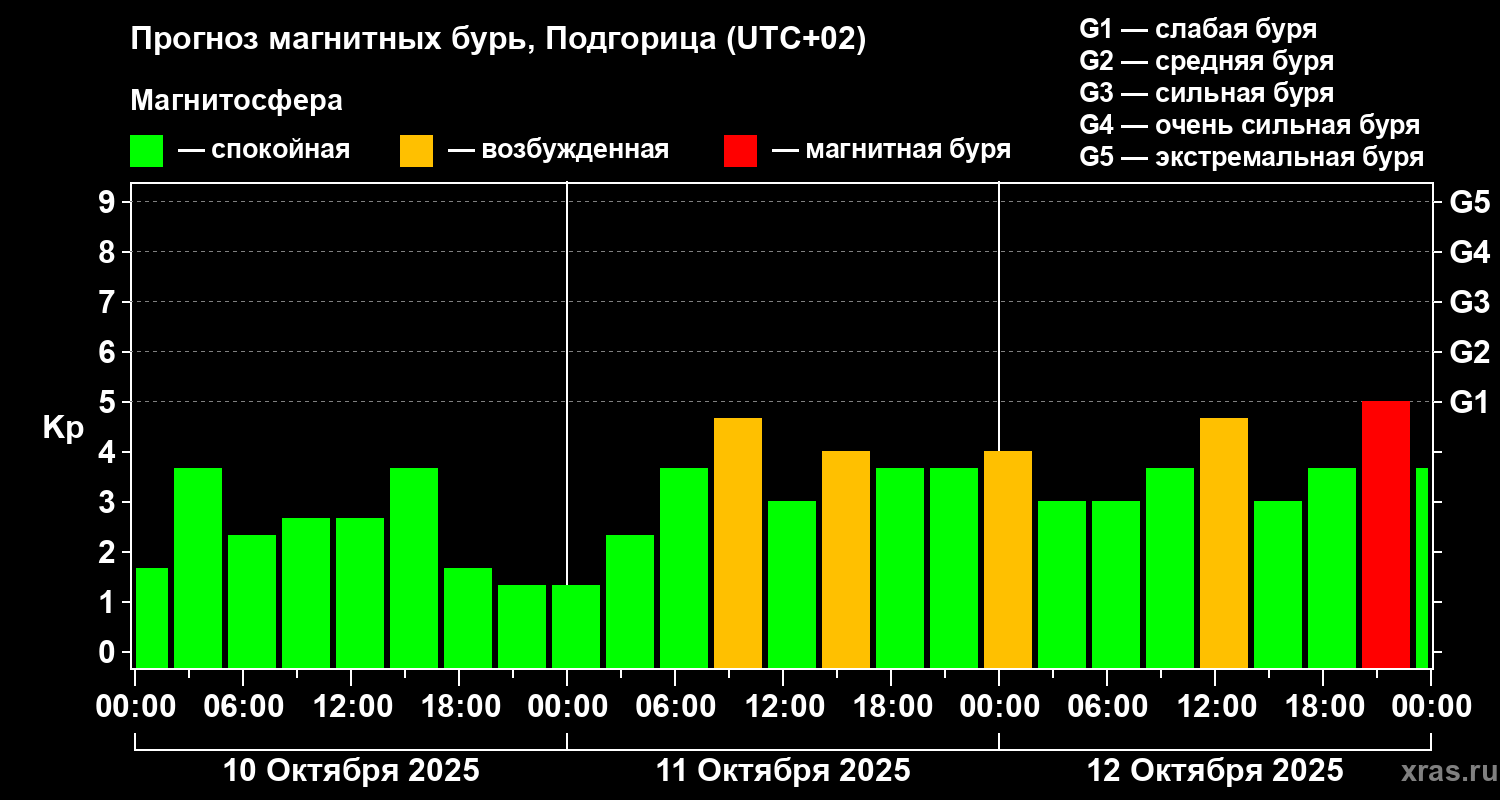 Прогноз магнитных бурь в Подгорице — 10 октября 2025 года
