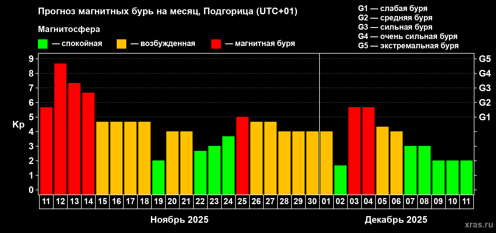 Прогноз магнитных бурь в Подгорице на 11 ноября 2025 года