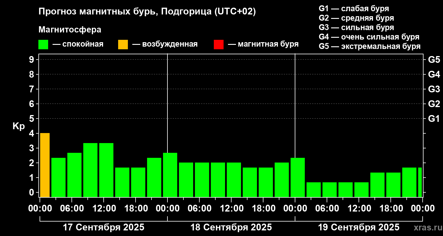 Прогноз магнитных бурь в Подгорице — 17 сентября 2025 года