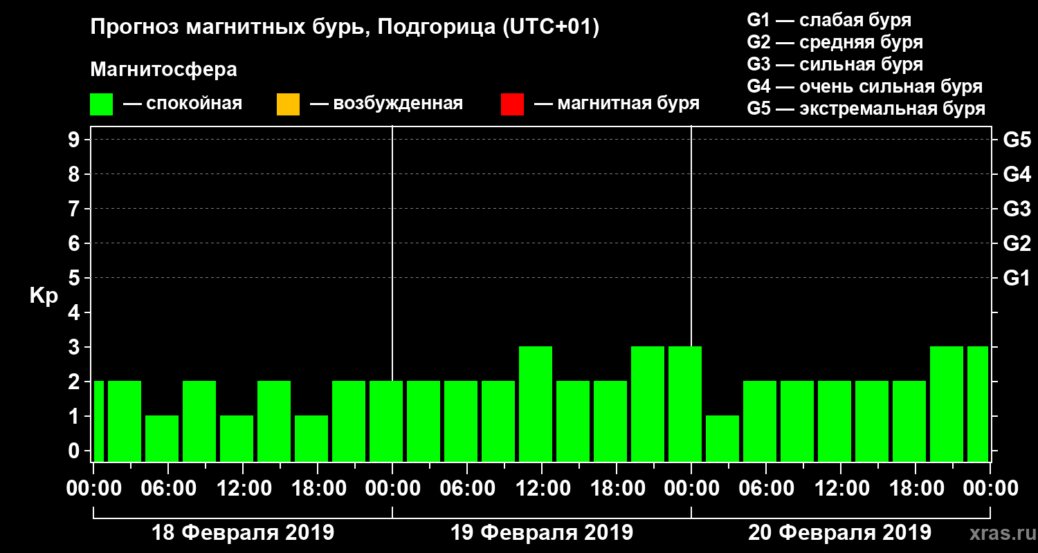 Прогноз магнитных бурь в Подгорице — 18 февраля 2019 года