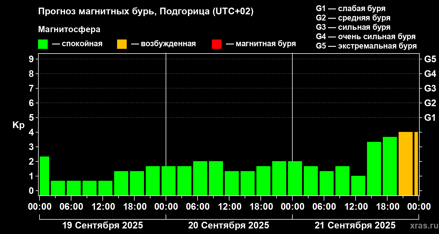 Прогноз магнитных бурь в Подгорице — 19 сентября 2025 года