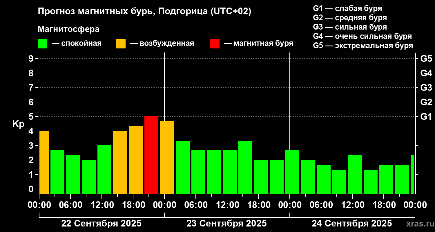 Прогноз магнитных бурь в Подгорице — 22 сентября 2025 года
