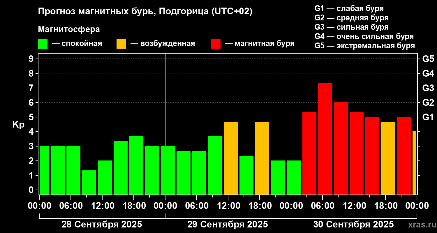 Прогноз магнитных бурь в Подгорице — 28 сентября 2025 года