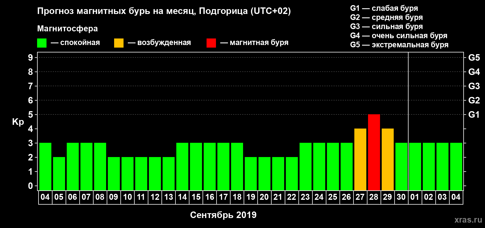 Прогноз магнитных бурь в Подгорице — 4 сентября 2019 года