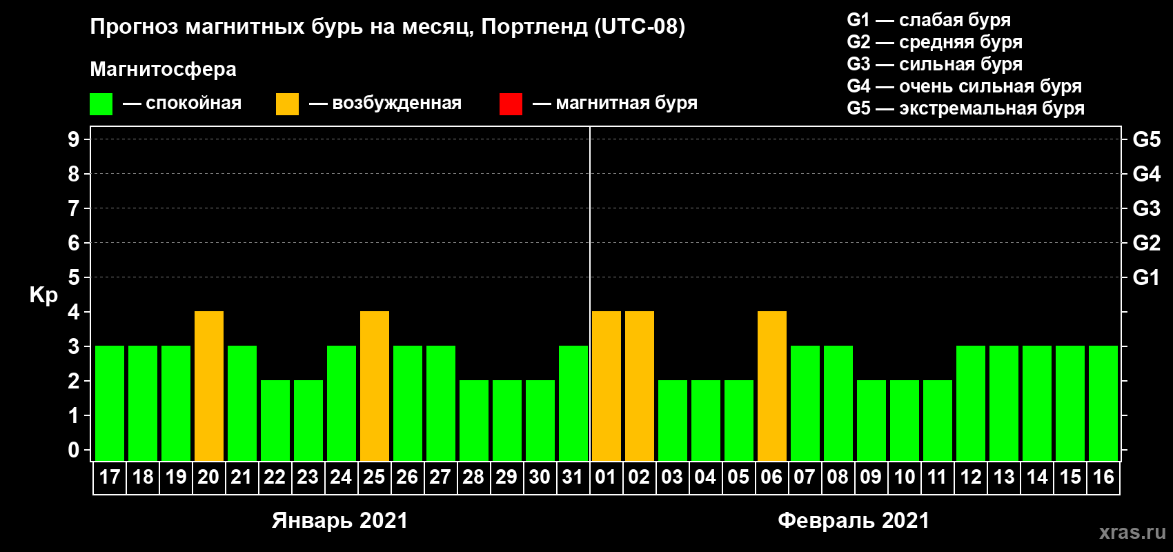 Прогноз магнитных бурь в Портленде на 17 января 2021 года