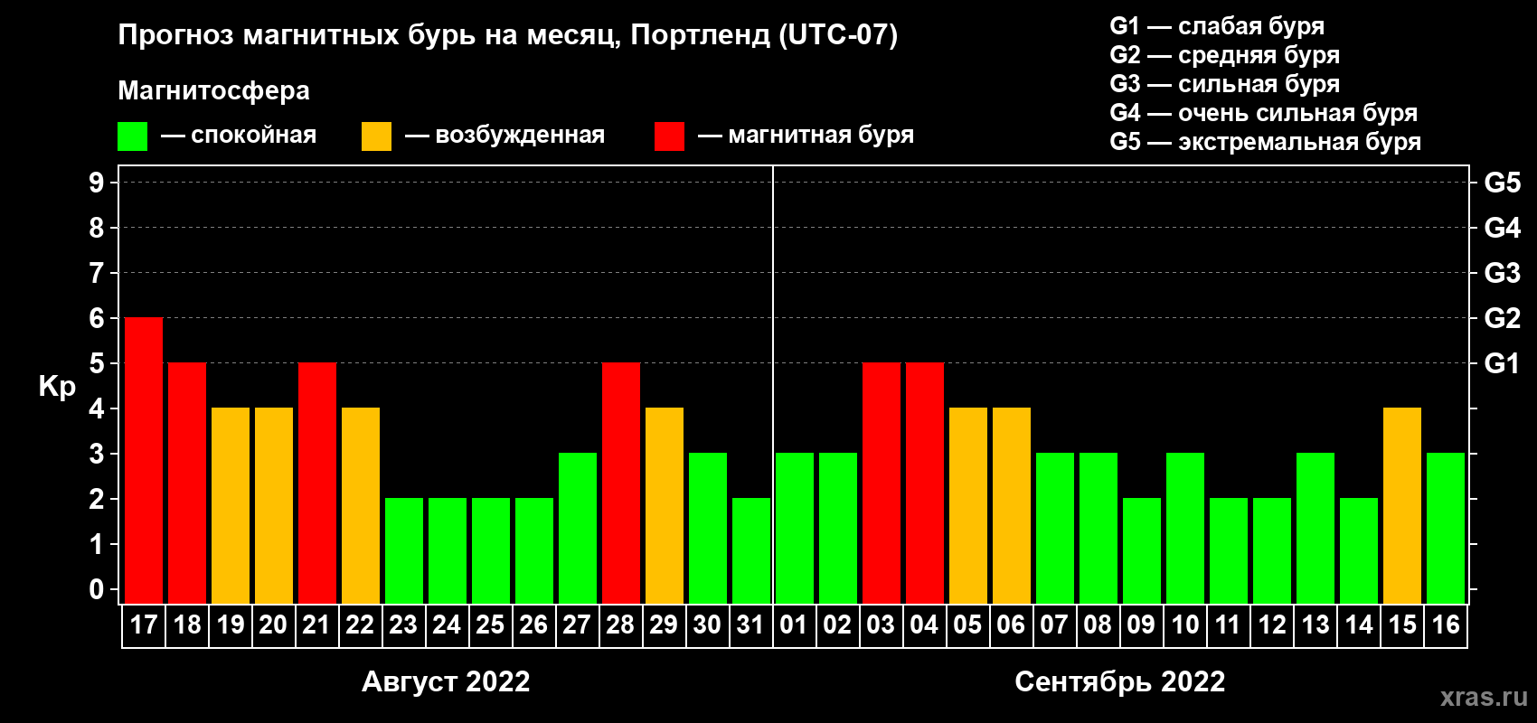 Прогноз магнитных бурь в Портленде на 17 августа 2022 года