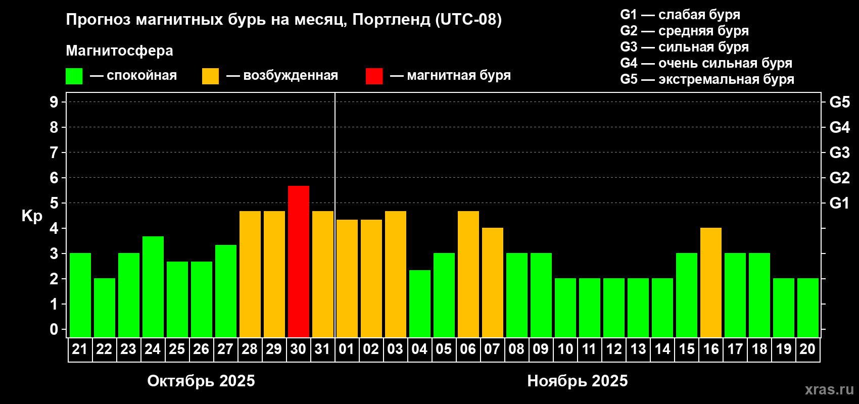 Прогноз магнитных бурь в Портленде на 21 октября 2025 года