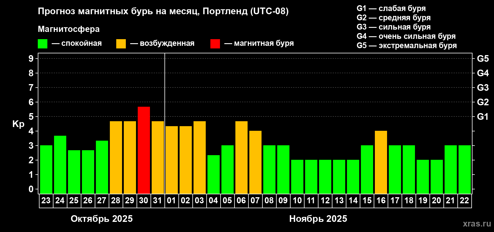 Прогноз магнитных бурь в Портленде на 23 октября 2025 года