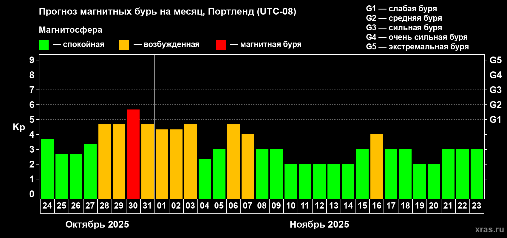 Прогноз магнитных бурь в Портленде на 24 октября 2025 года
