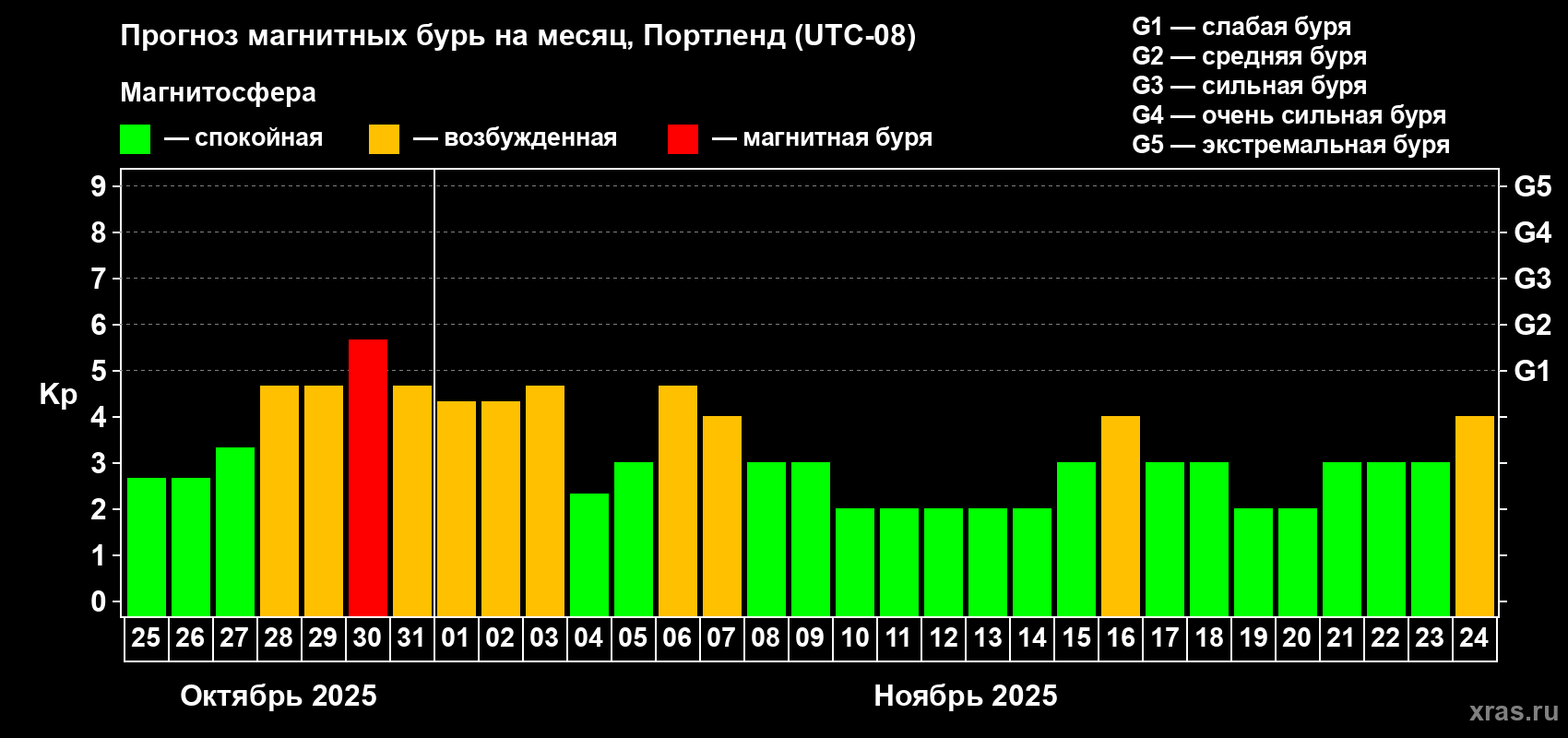 Прогноз магнитных бурь в Портленде на 25 октября 2025 года