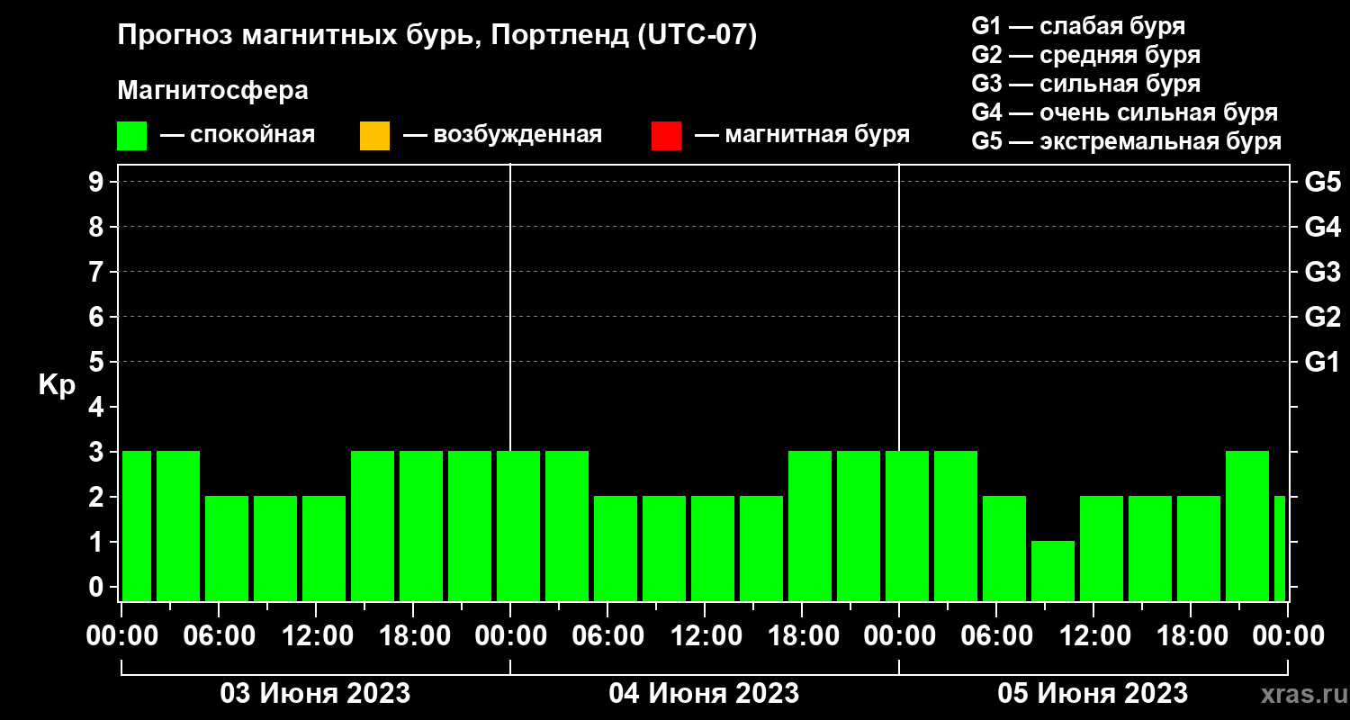 Прогноз магнитных бурь в Портленде на 3 июня 2023 года
