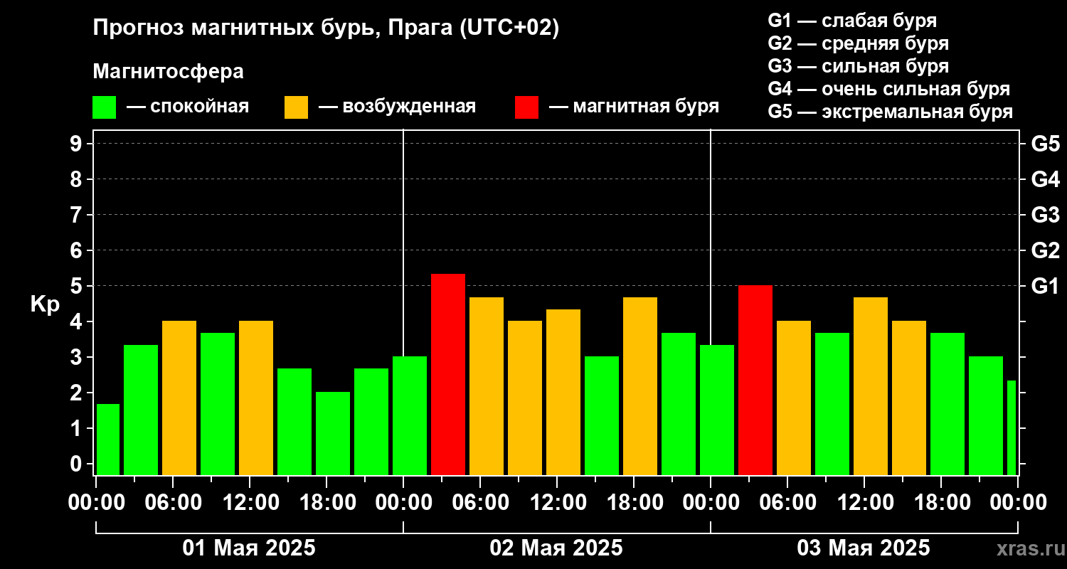 Прогноз магнитных бурь в Праге на 1 мая 2025 года
