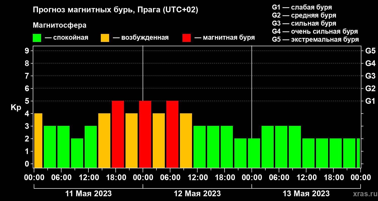 Прогноз магнитных бурь в Праге — 11 мая 2023 года