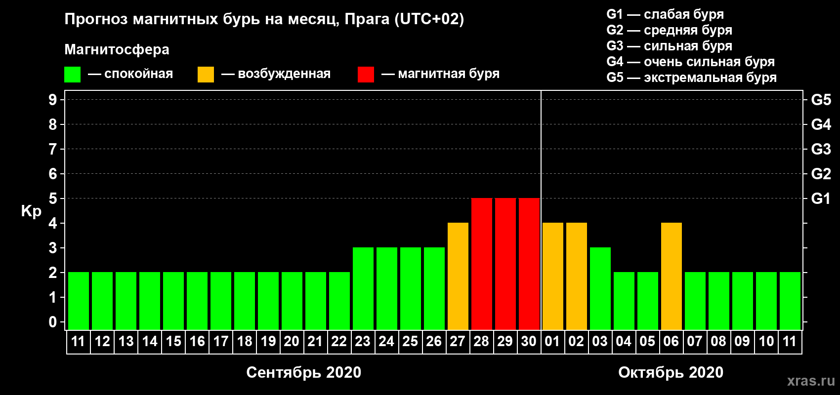 Прогноз магнитных бурь в Праге — 11 сентября 2020 года