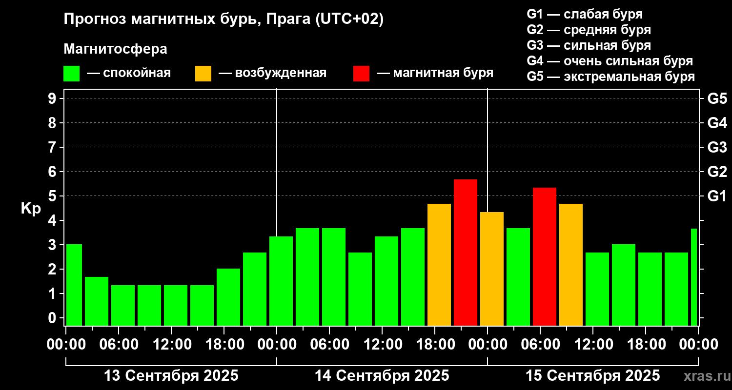 Прогноз магнитных бурь в Праге на 13 сентября 2025 года