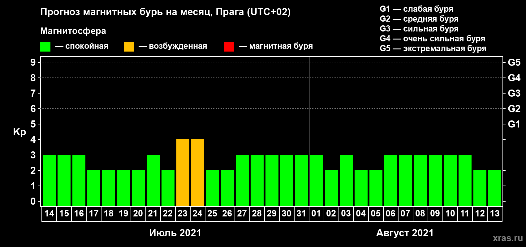 Прогноз магнитных бурь в Праге — 14 июля 2021 года