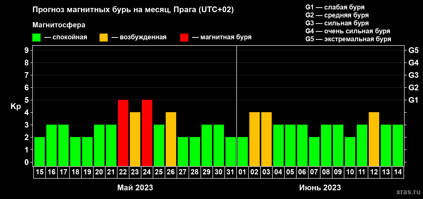 Прогноз магнитных бурь в Праге — 15 мая 2023 года