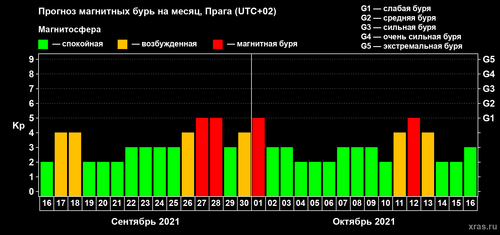 Прогноз магнитных бурь в Праге — 16 сентября 2021 года