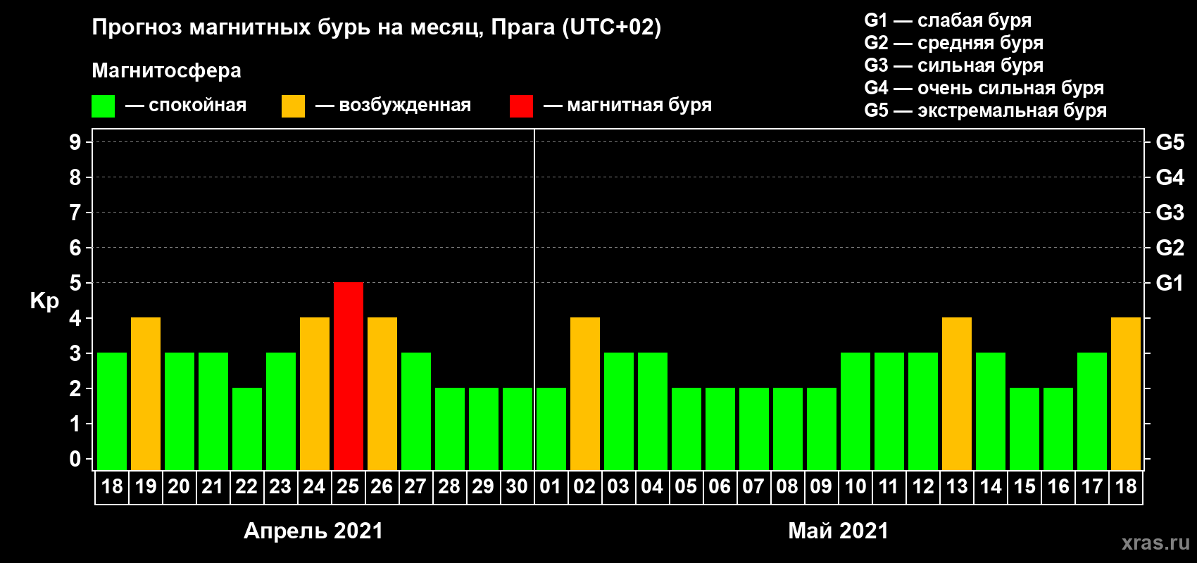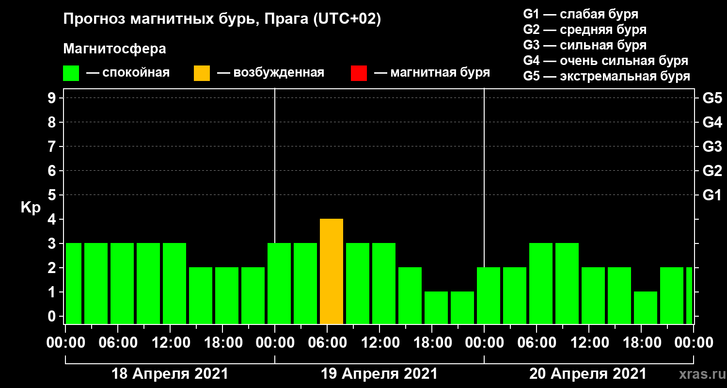 Прогноз магнитных бурь в Праге — 18 апреля 2021 года