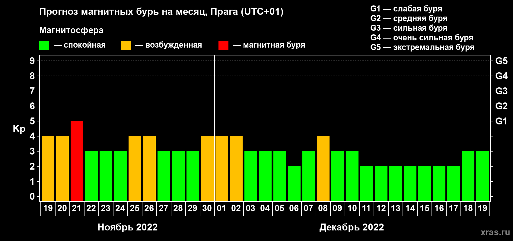 Прогноз магнитных бурь в Праге — 19 ноября 2022 года