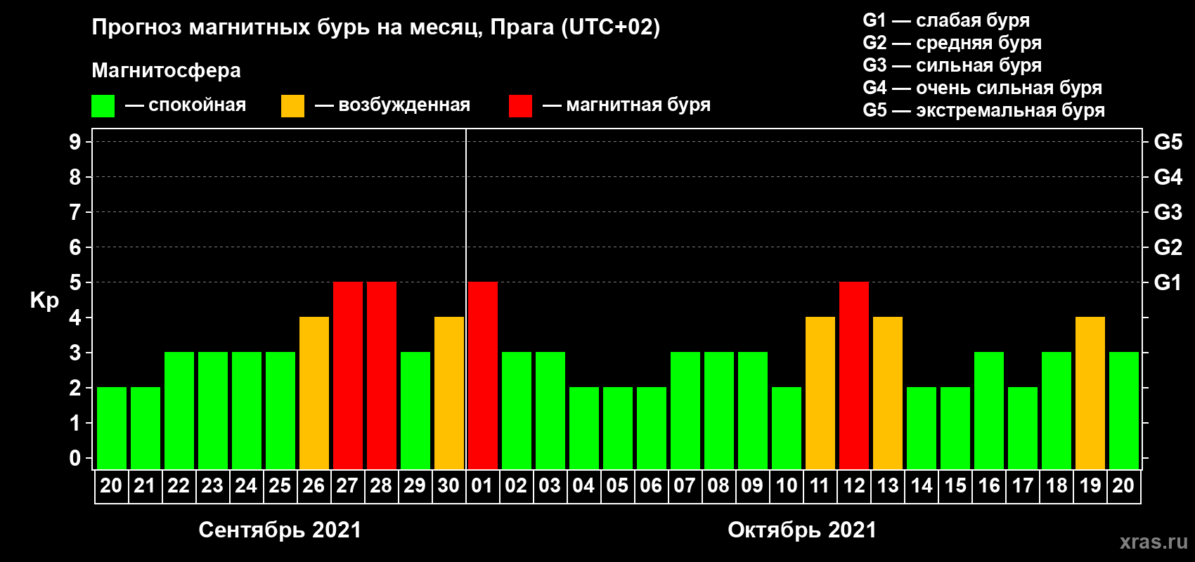 Прогноз магнитных бурь в Праге — 20 сентября 2021 года