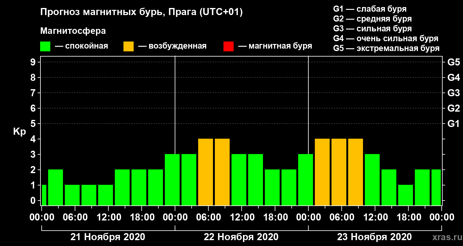 Прогноз магнитных бурь в Праге — 21 ноября 2020 года