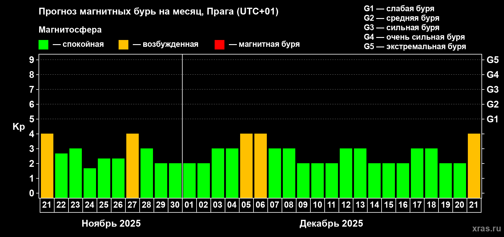 Прогноз магнитных бурь в Праге — 21 ноября 2025 года