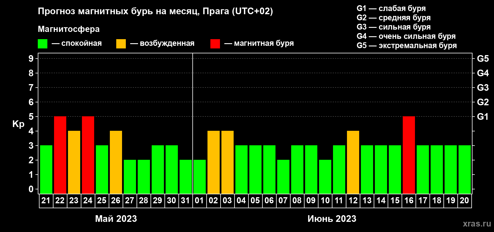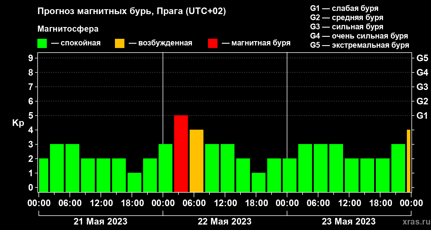 Прогноз магнитных бурь в Праге — 21 мая 2023 года