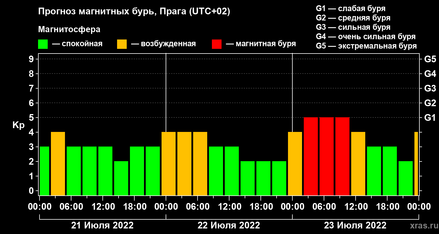 Прогноз магнитных бурь в Праге — 21 июля 2022 года