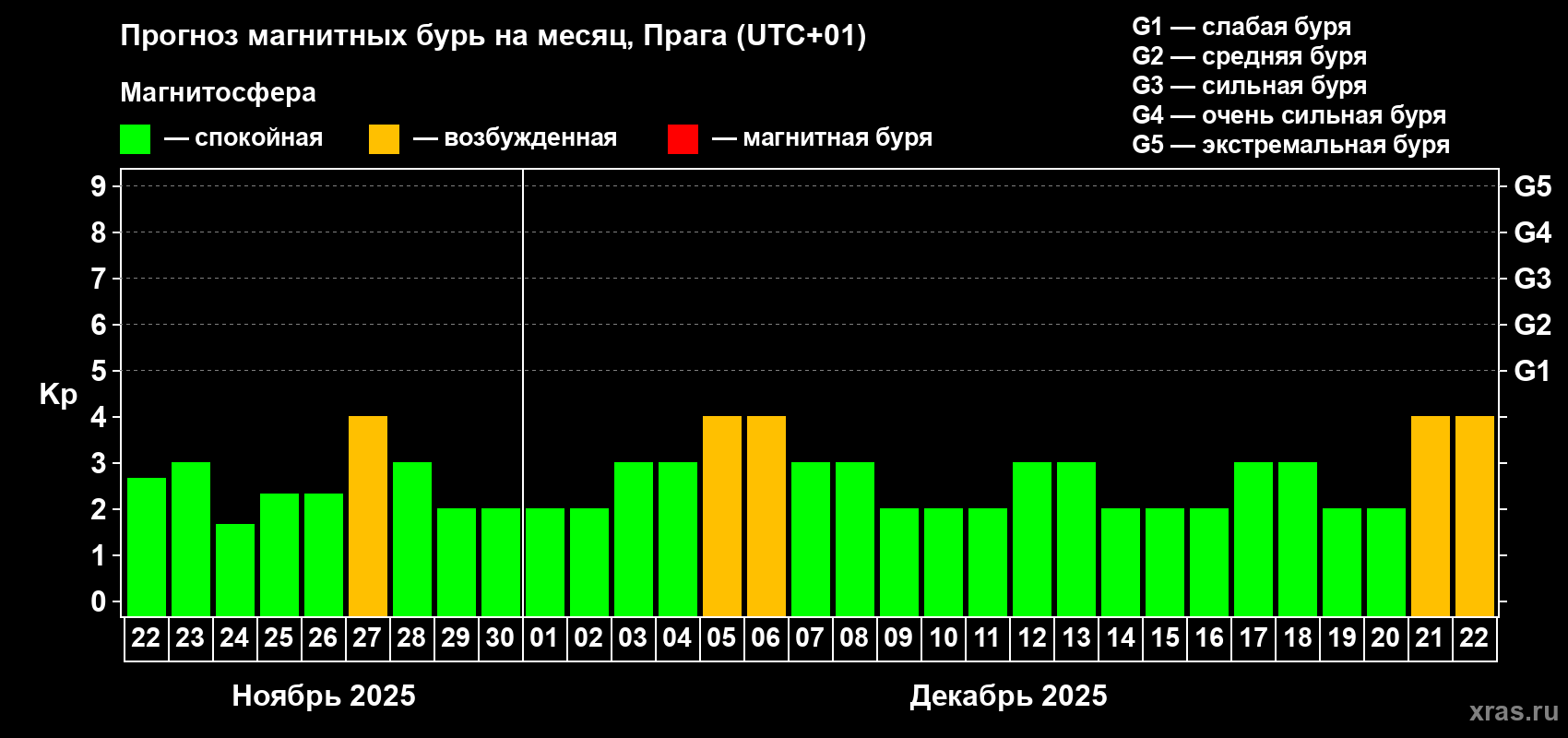 Прогноз магнитных бурь в Праге — 22 ноября 2025 года