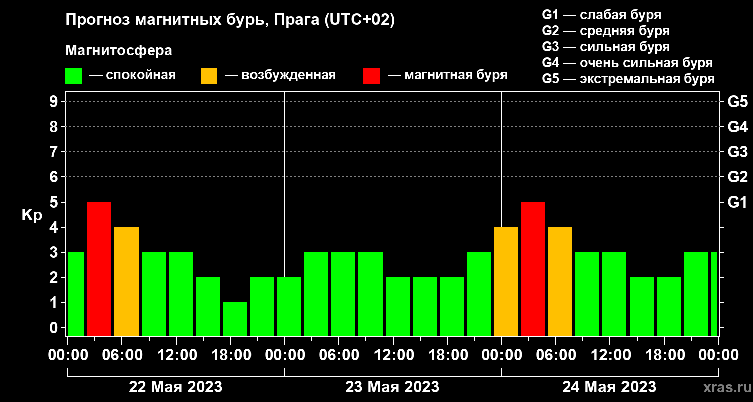 Прогноз магнитных бурь в Праге — 22 мая 2023 года