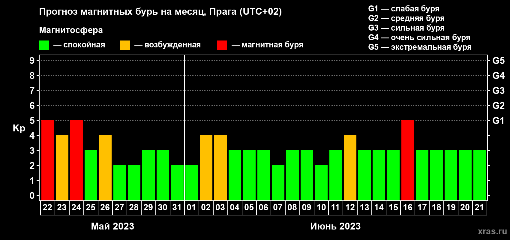 Прогноз магнитных бурь в Праге на 22 мая 2023 года