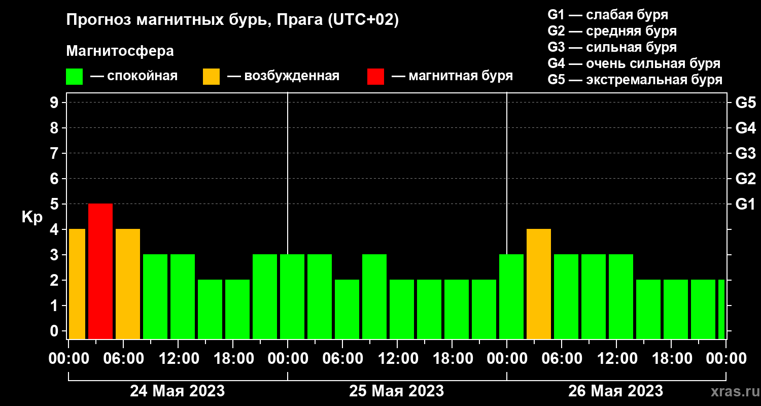 Прогноз магнитных бурь в Праге — 24 мая 2023 года