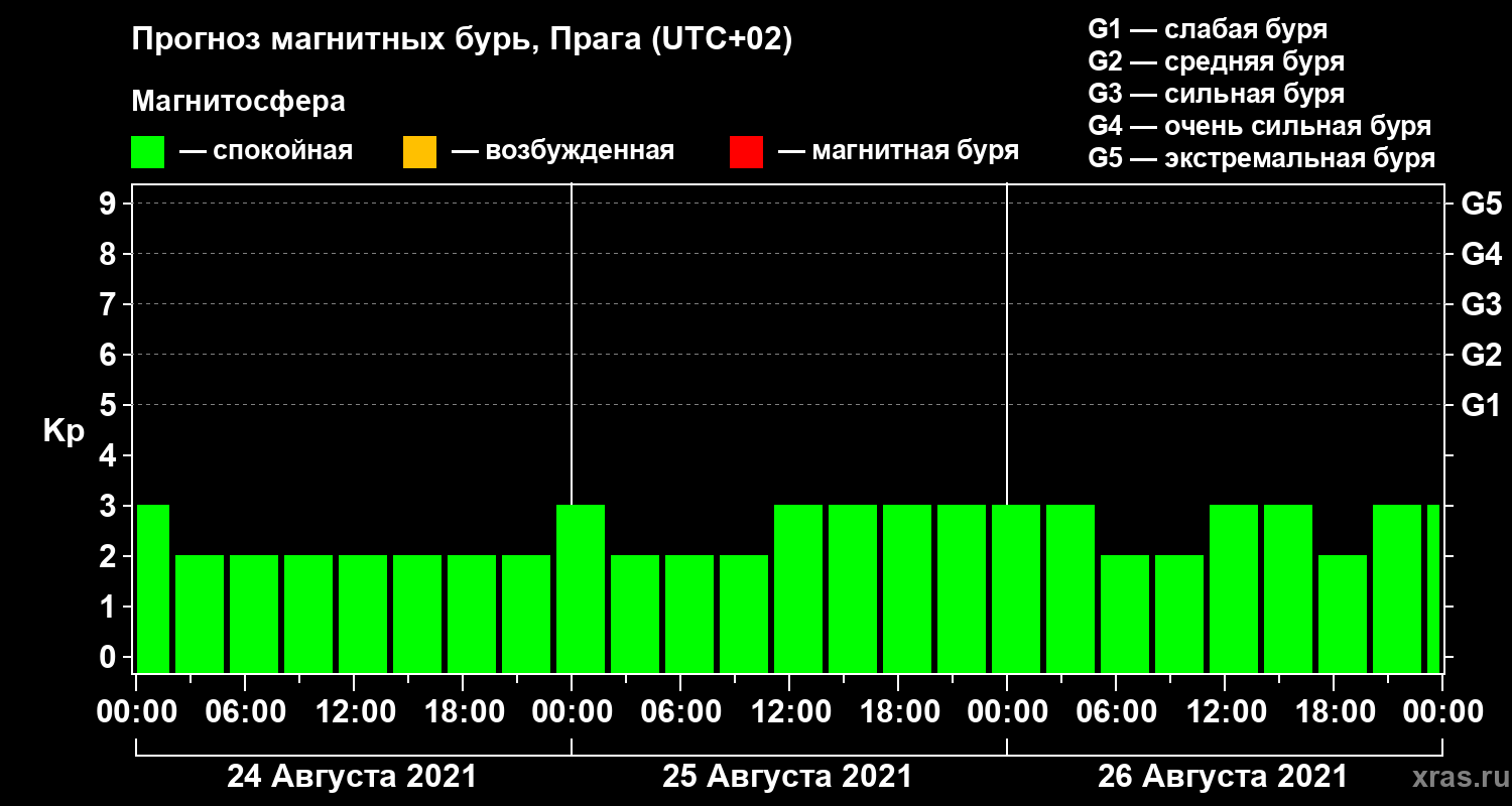 Прогноз магнитных бурь в Праге — 24 августа 2021 года