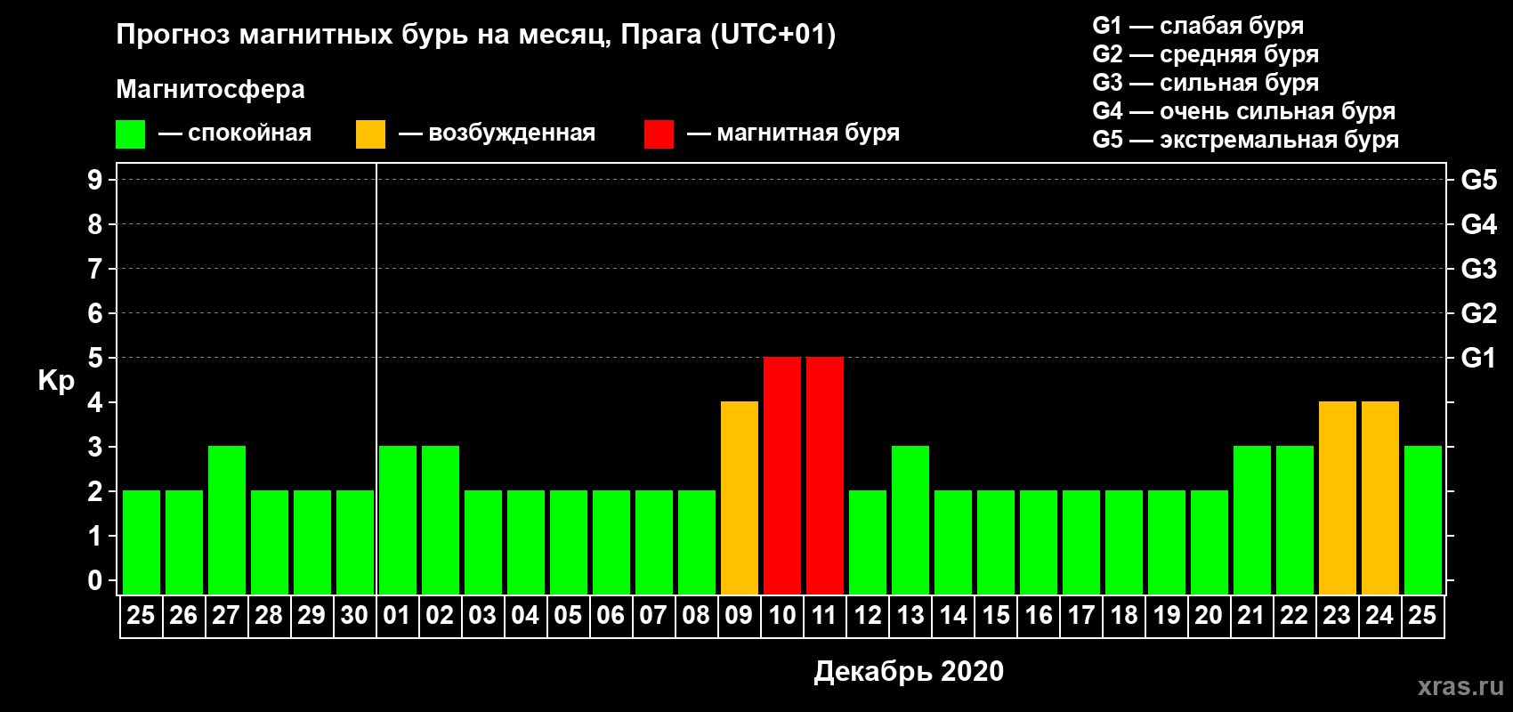 Прогноз магнитных бурь в Праге — 25 ноября 2020 года