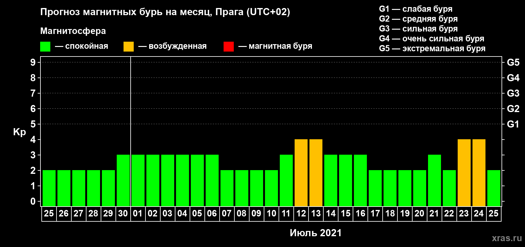 Прогноз магнитных бурь в Праге — 25 июня 2021 года