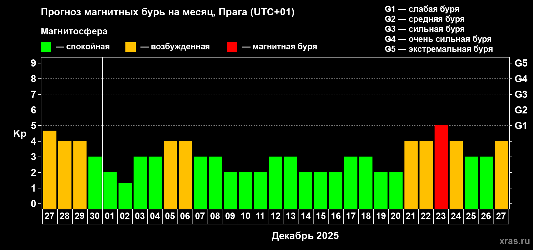 Прогноз магнитных бурь в Праге — 27 ноября 2025 года