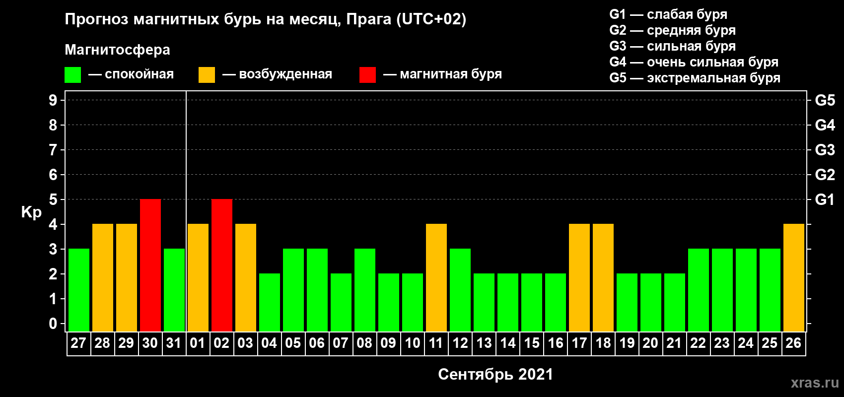 Прогноз магнитных бурь в Праге — 27 августа 2021 года
