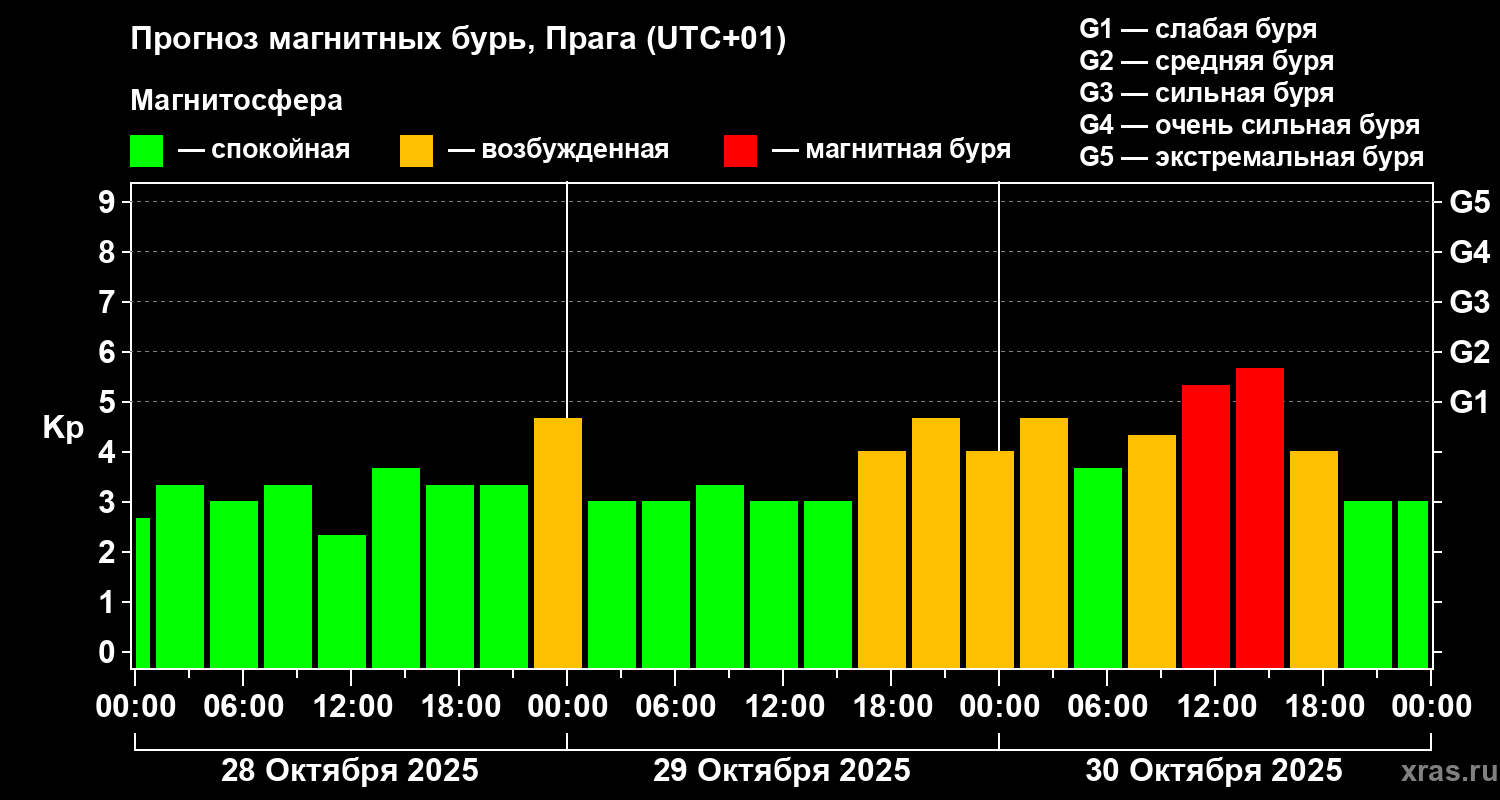 Прогноз магнитных бурь в Праге на 28 октября 2025 года
