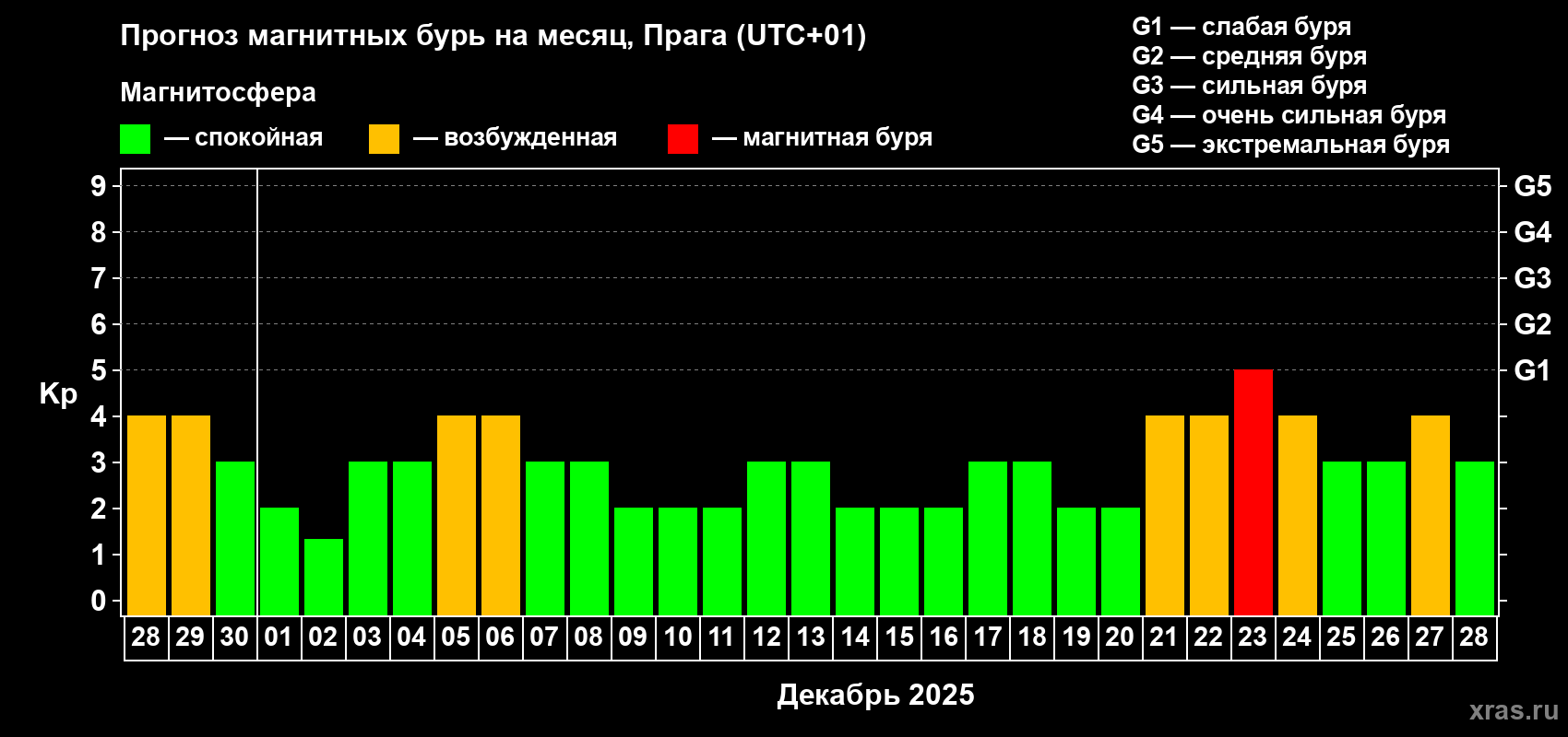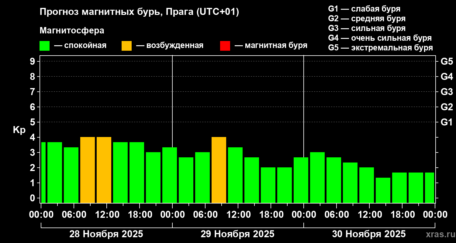 Прогноз магнитных бурь в Праге — 28 ноября 2025 года