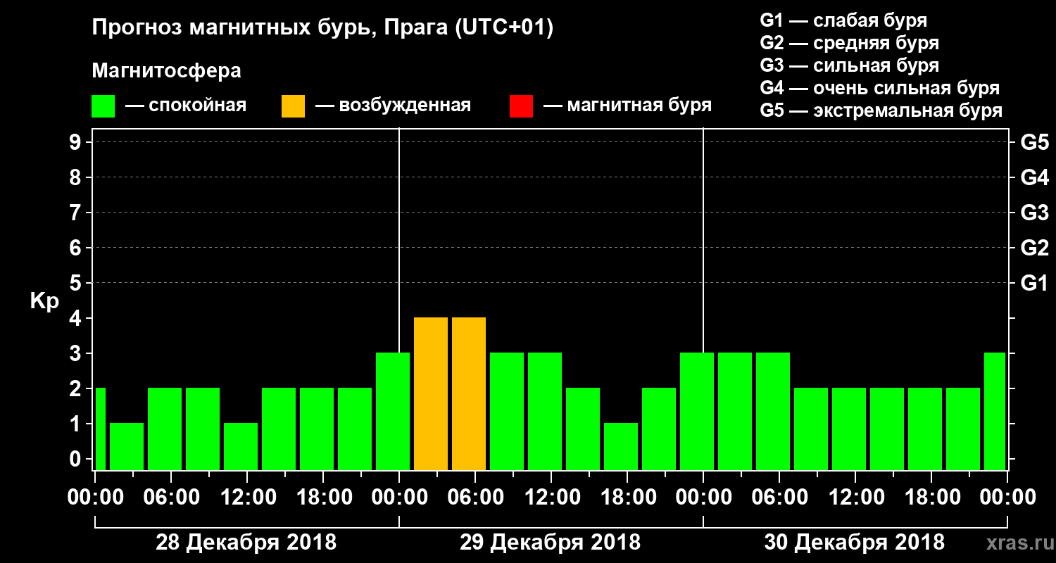 Прогноз магнитных бурь в Праге — 28 декабря 2018 года