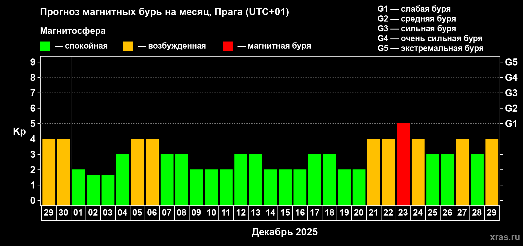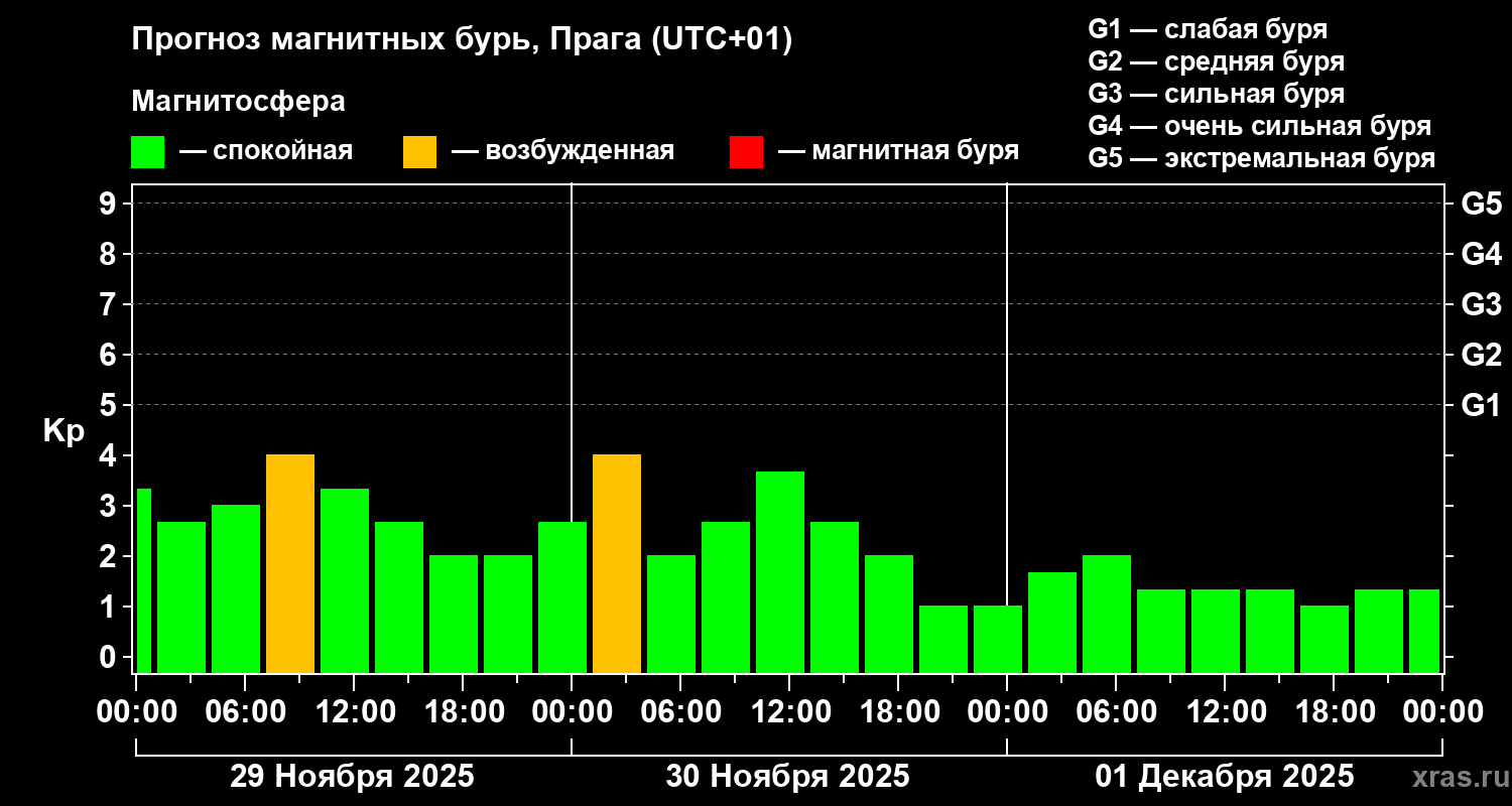 Прогноз магнитных бурь в Праге — 29 ноября 2025 года