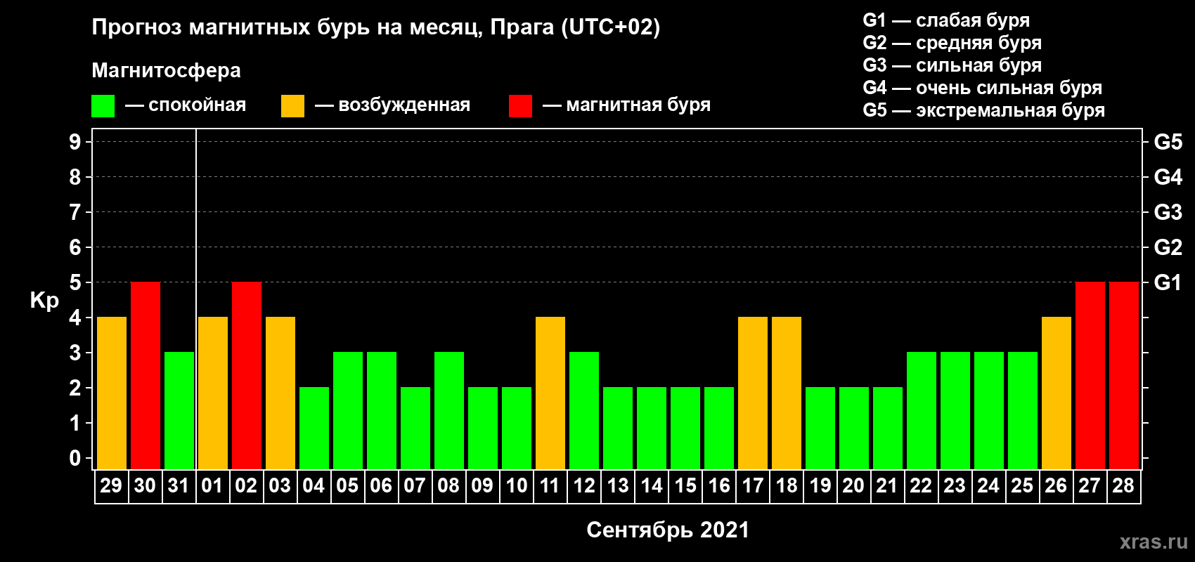 Прогноз магнитных бурь в Праге — 29 августа 2021 года