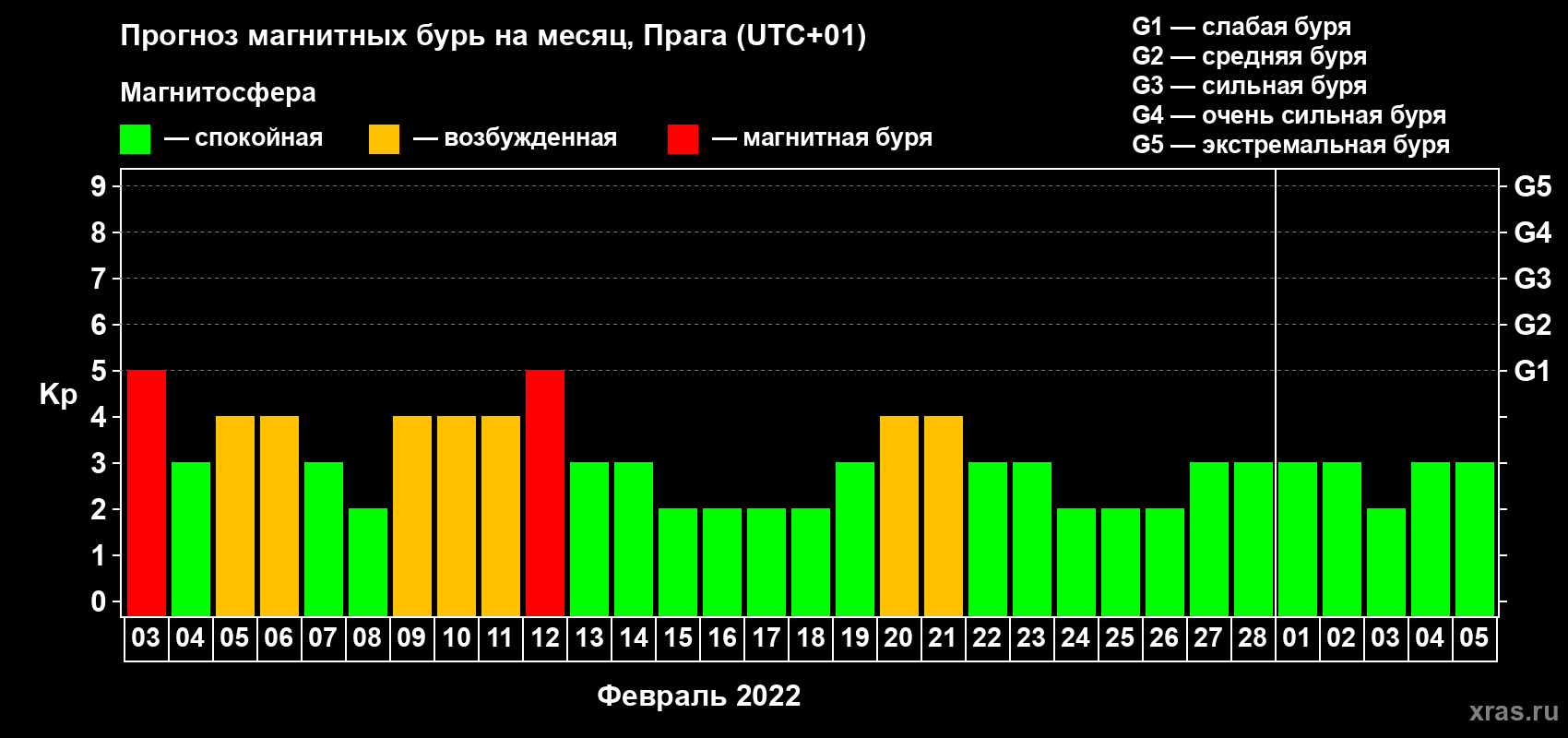 Прогноз магнитных бурь в Праге — 3 февраля 2022 года